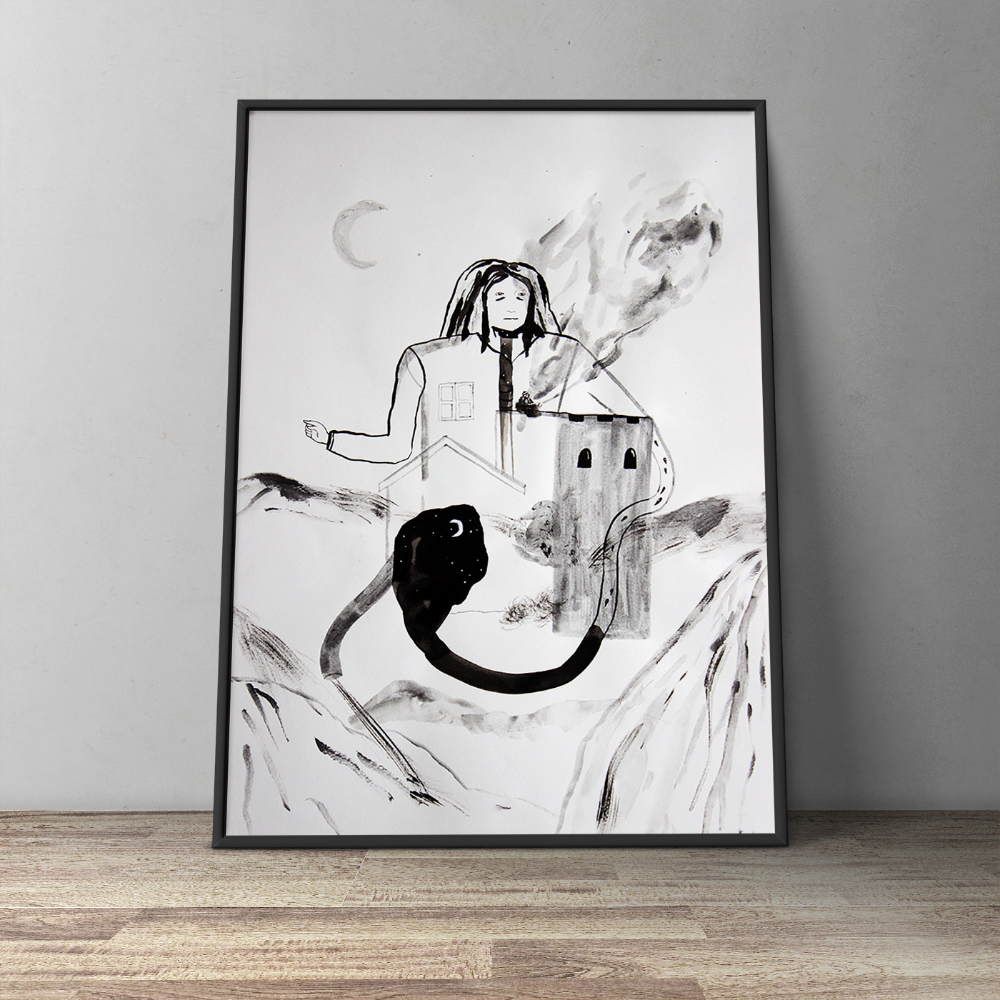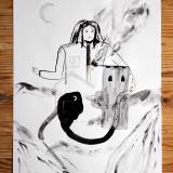 Blæk, akvarel og kul på syrefrit kunstpapir.
