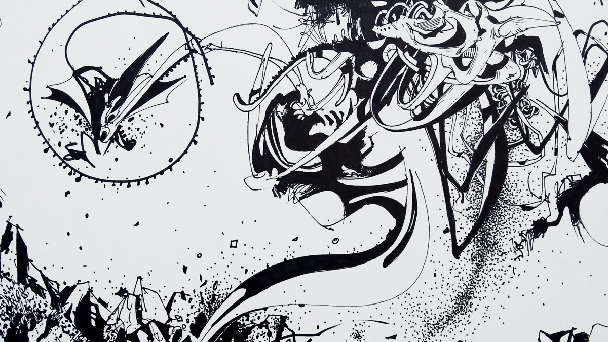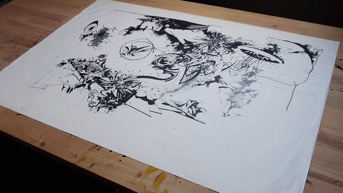 "I arbejdet med tuschtegningen, er jeg optaget af at finde en spontan og fri måde at bygge op et billede på. Jeg prøver at udgå fra tilfældigheder og øjeblikkets indskydelser. Til en begyndelse lader jeg instinktive streger, bevægelser, fragmenter fylde papiret. Til synes uden mening og samspil. Disse lapsus interesserer mig. De giver mig muligheder.
